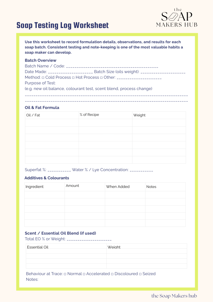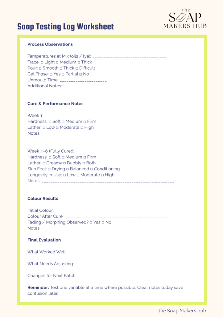 It’s structured to support real formulation learning, not just note-taking — oils, additives, scent behaviour, cure observations, and final evaluation are all captured in one place.